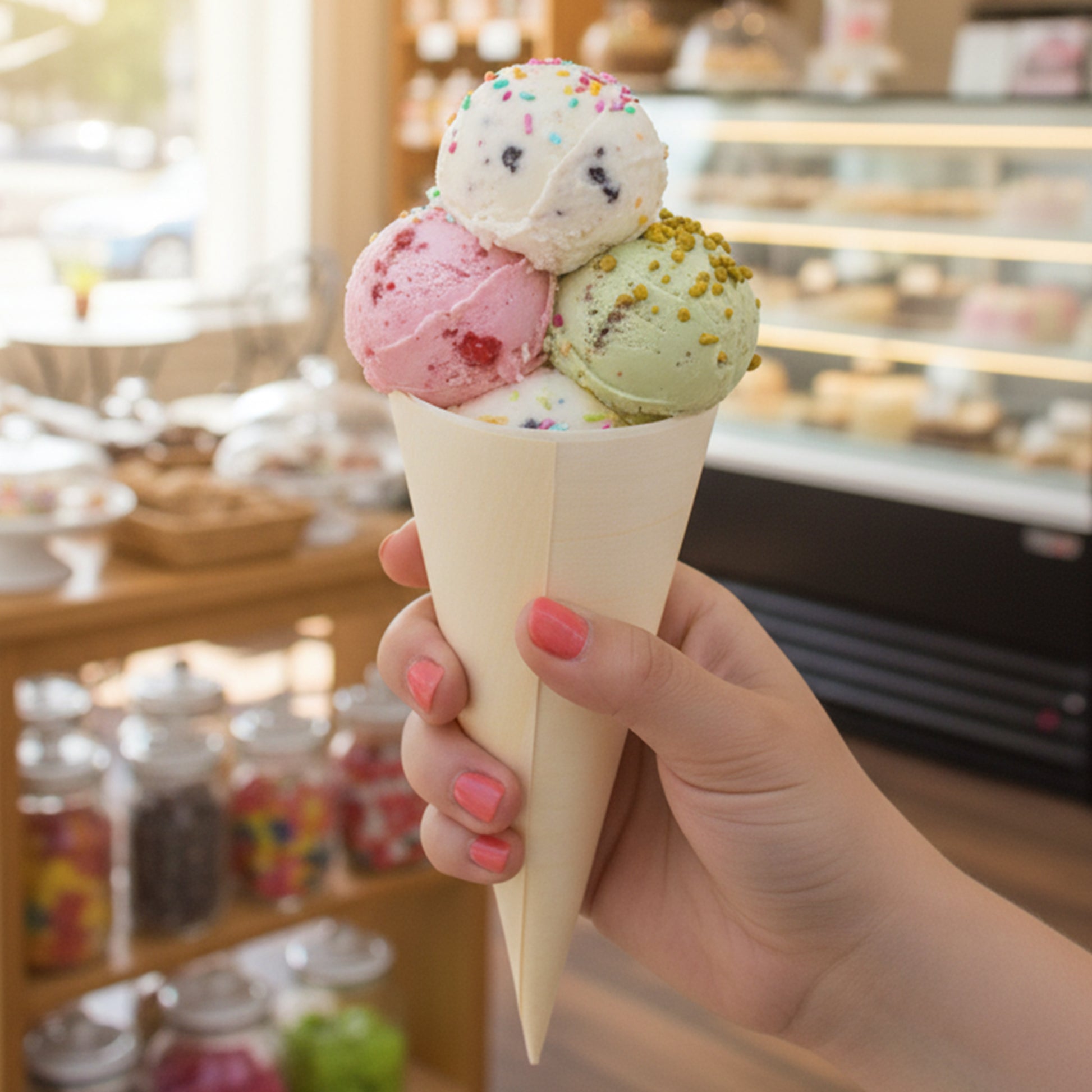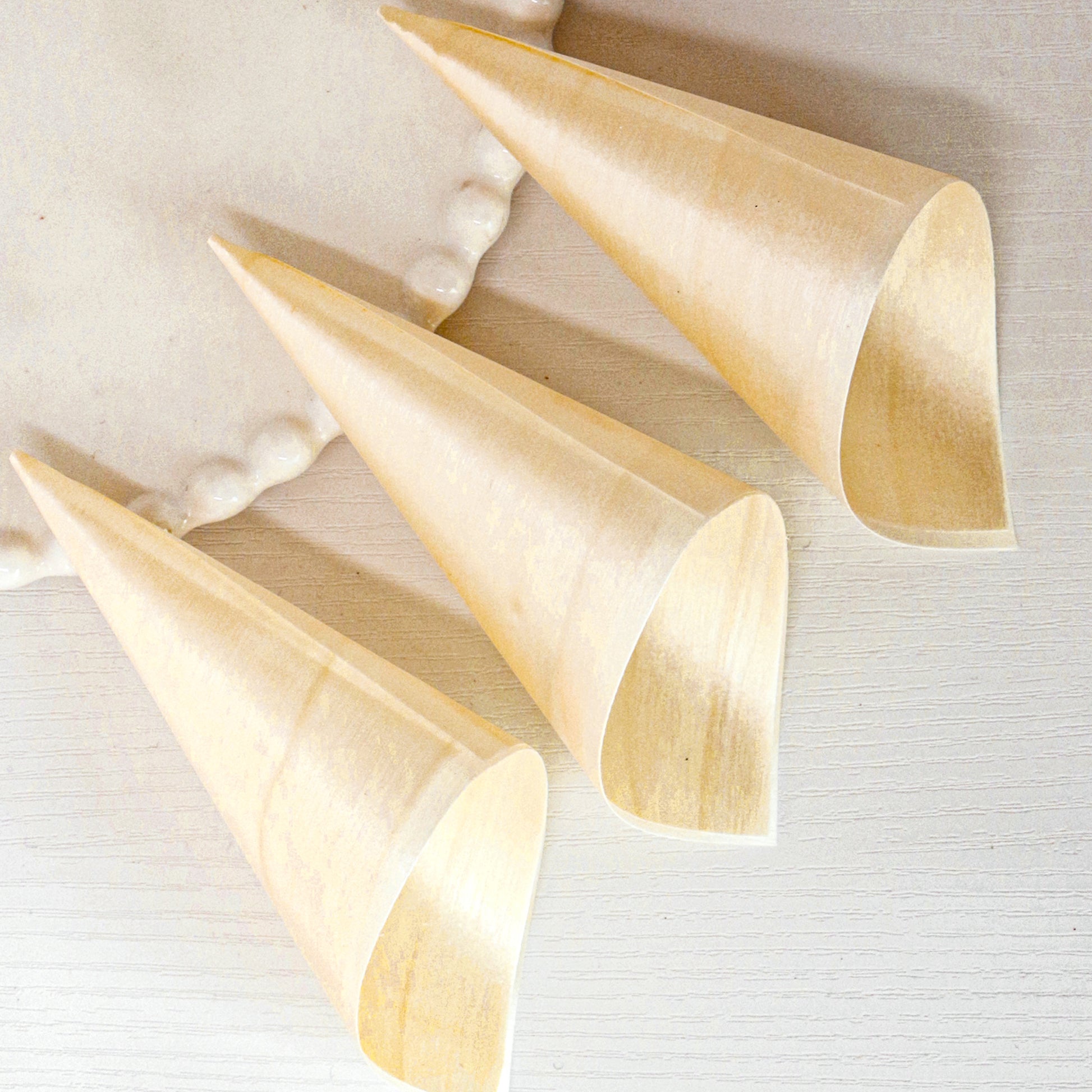 Biocean 3" Disposable Wooden Cone made from eco-friendly, biodegradable wood,are perfect for serving ice cream, nuts, or small desserts. Compact and sturdy, they are ideal for parties, food trucks, and catering events. Enjoy a rustic, natural presentation while choosing a sustainable alternative to plastic.