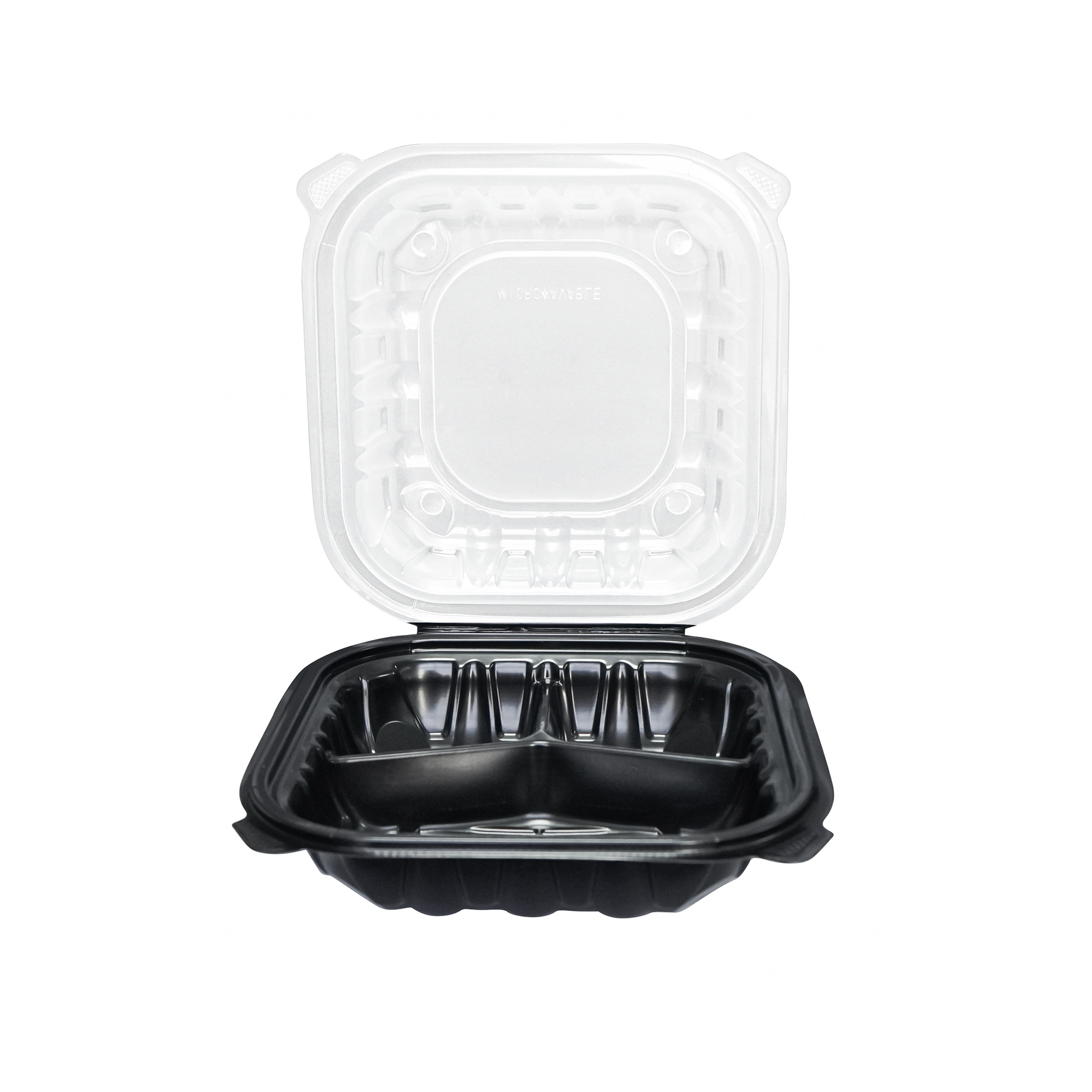 [100ct] 8" x 8" Premium PP Hinged Food Containers | 3-Compartment | Clear and Black