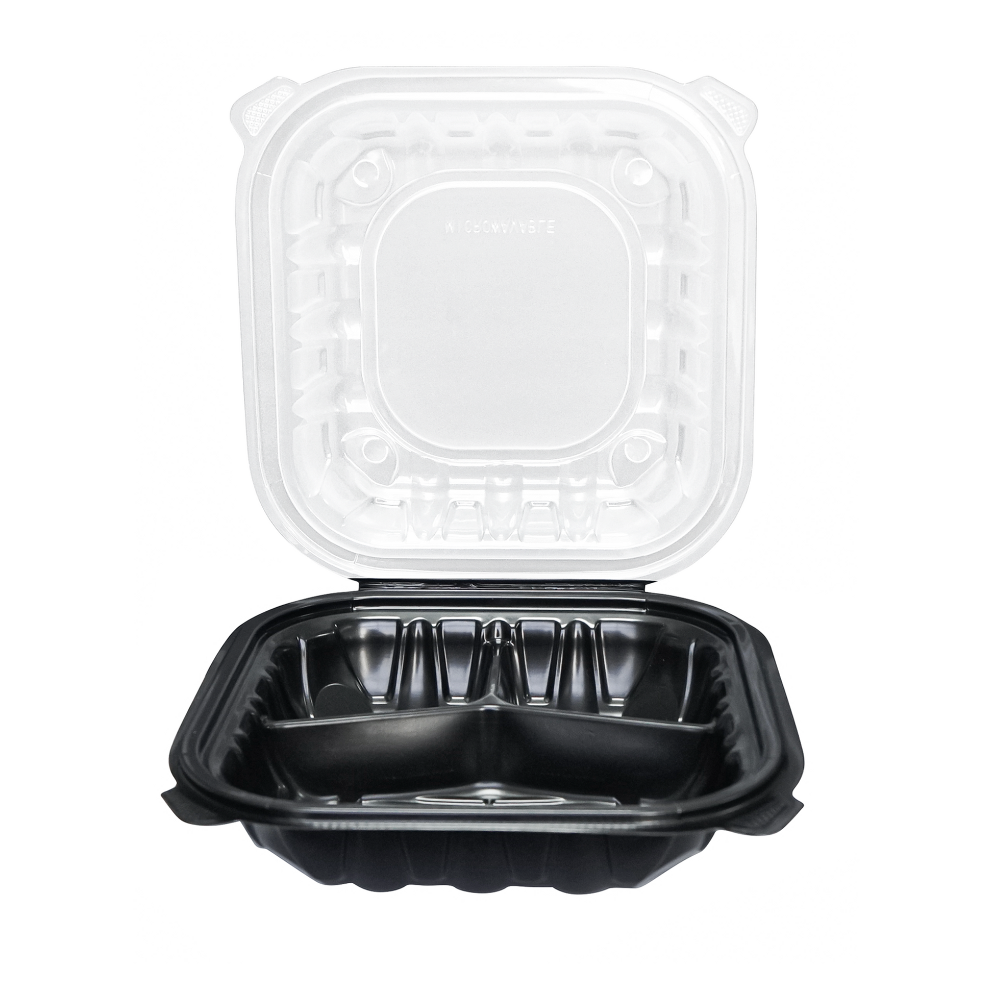 [100ct] 9" x 9" Premium PP Hinged Food Containers | 3-Compartment | Clear and Black