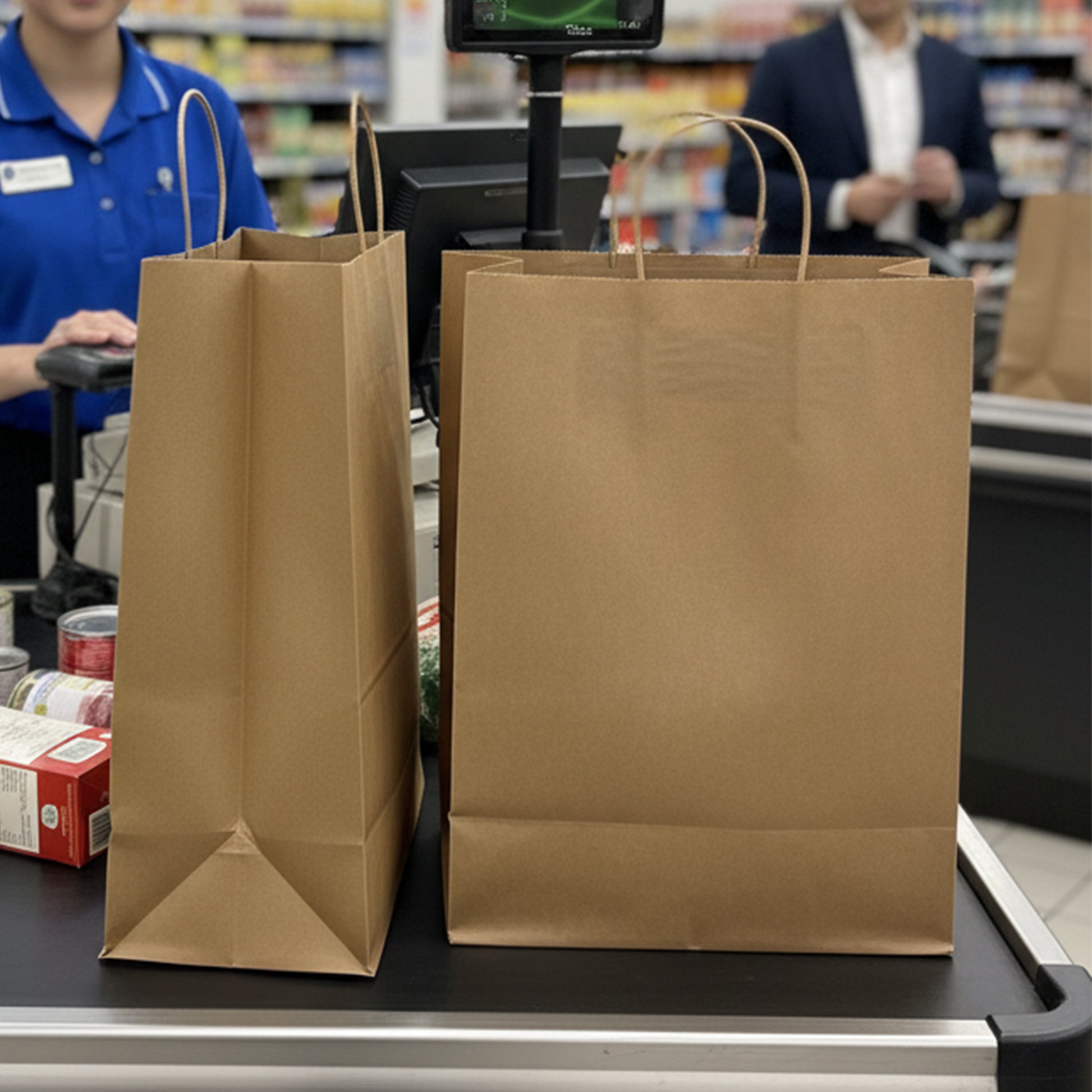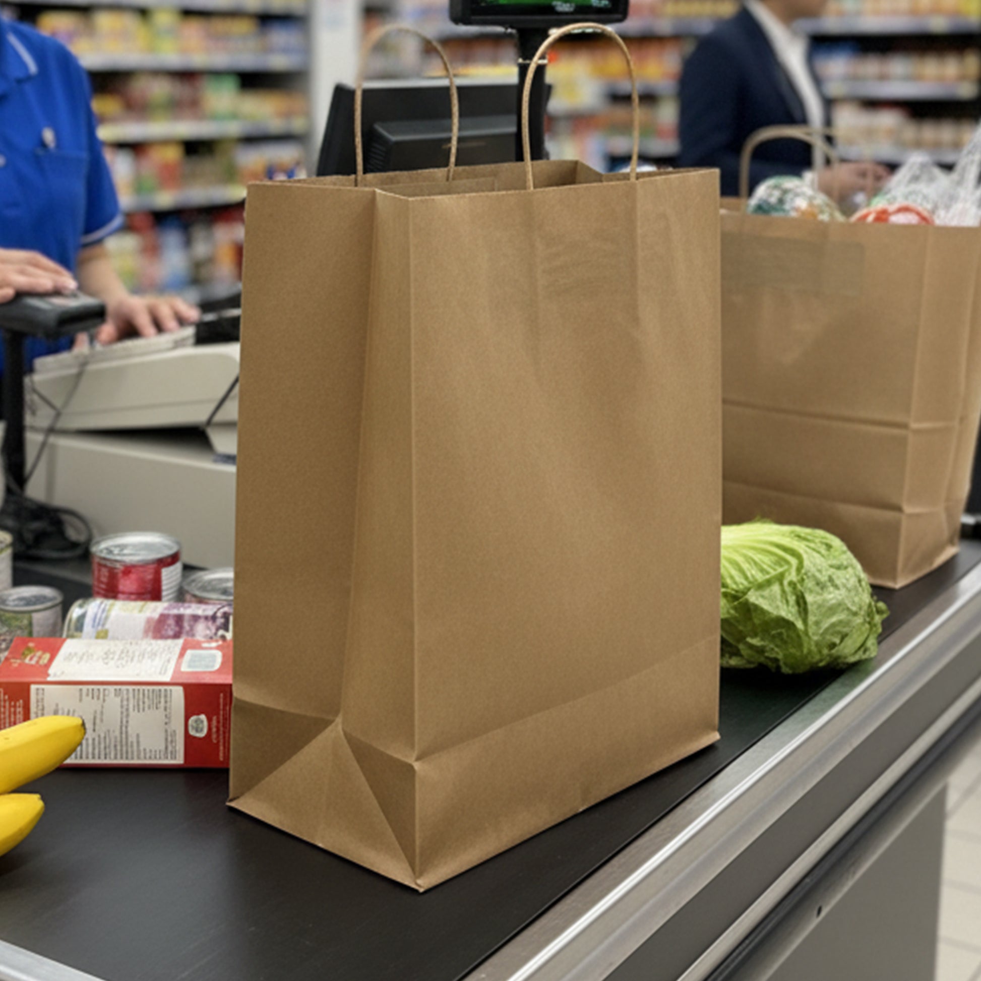 Biocean Kraft Paper Shopping Bags with Handles are durable and eco-friendly bags perfect for retail, food service, or takeout packaging. Made from sturdy kraft paper, these bags provide excellent strength for carrying heavier items like groceries, clothing, or baked goods. The strong twisted handles ensure a comfortable grip, while the flat bottom allows easy loading and stable placement. Ideal for restaurants, boutiques, and gift shops seeking a sustainable packaging solution.