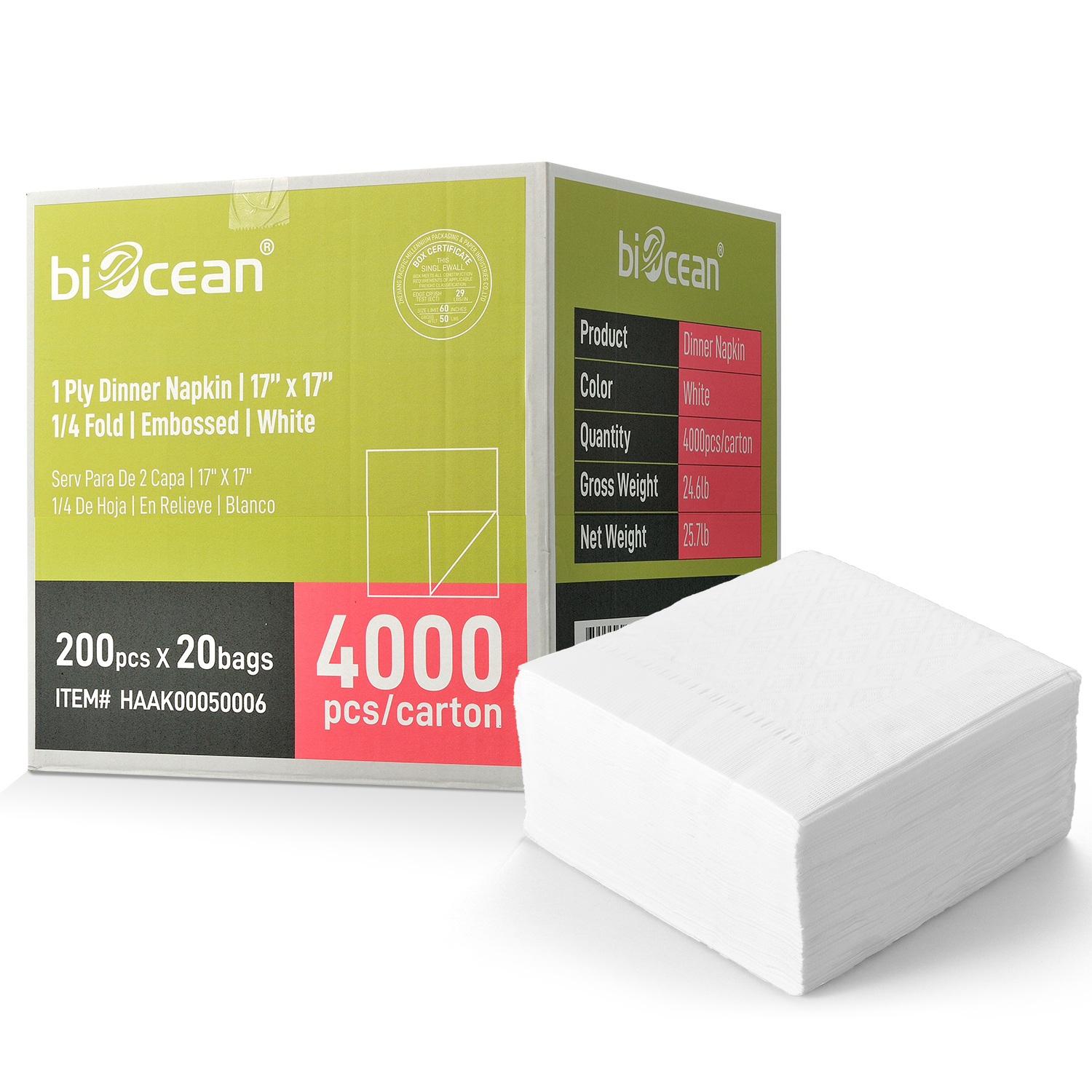 Biocean 1-Ply 1/4 Fold Dinner Napkins crafted from high-quality single-ply pulp, they provide softness and reliable absorbency for family dinners, casual dining restaurants, and social gatherings.The neat folding format ensures easy dispensing and tidy presentation, enhancing dining convenience. Economical and eco-friendly, these napkins deliver both practicality and aesthetic appeal for everyday use.