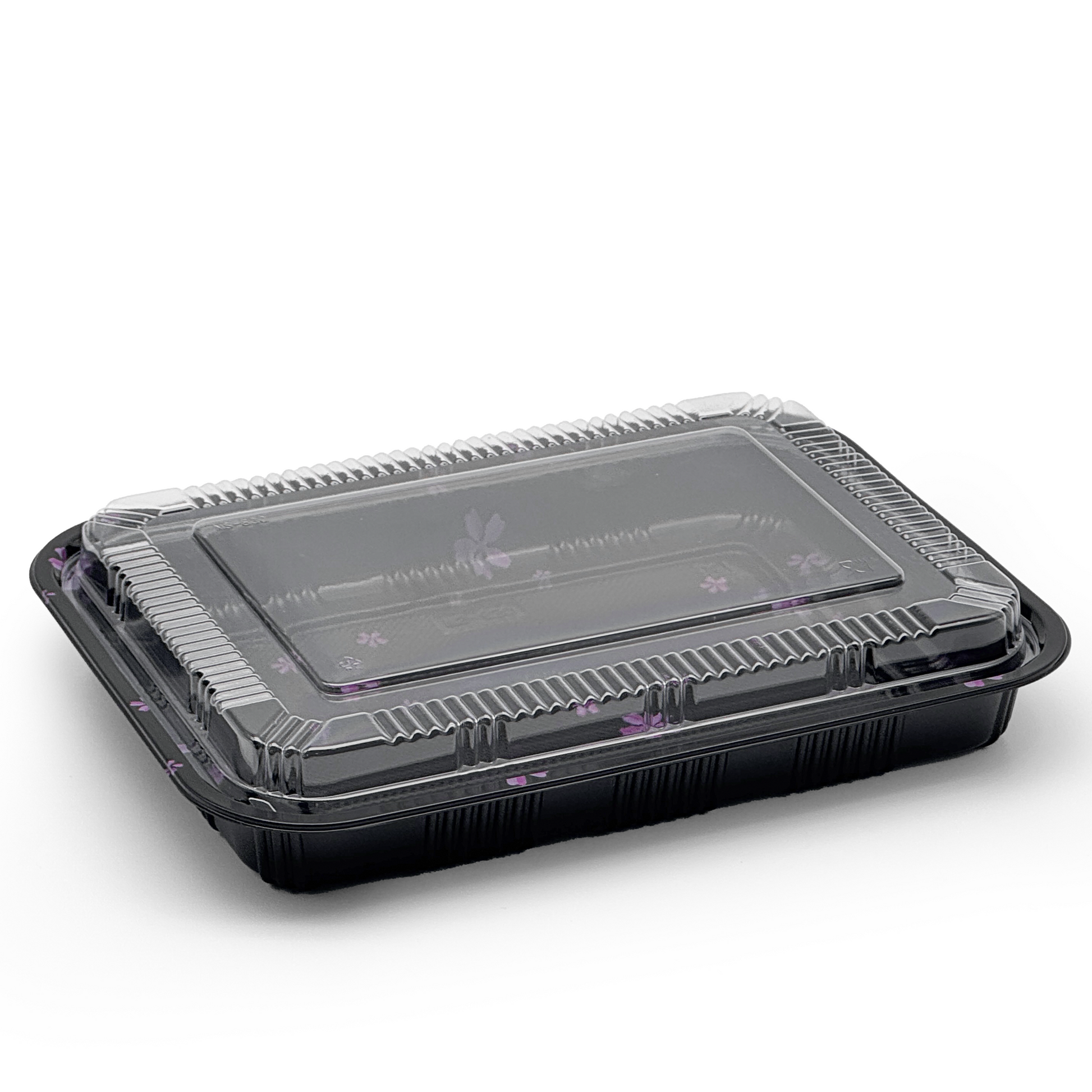 Biocean PS Plastic Rectangular Food Containers & Lids provide a large, shallow capacity that works well for entrees, sushi sets, bento meals, and assorted food combinations. The black patterned base adds a clean, premium presentation, while the clear lid keeps product visible and secure during display or delivery.