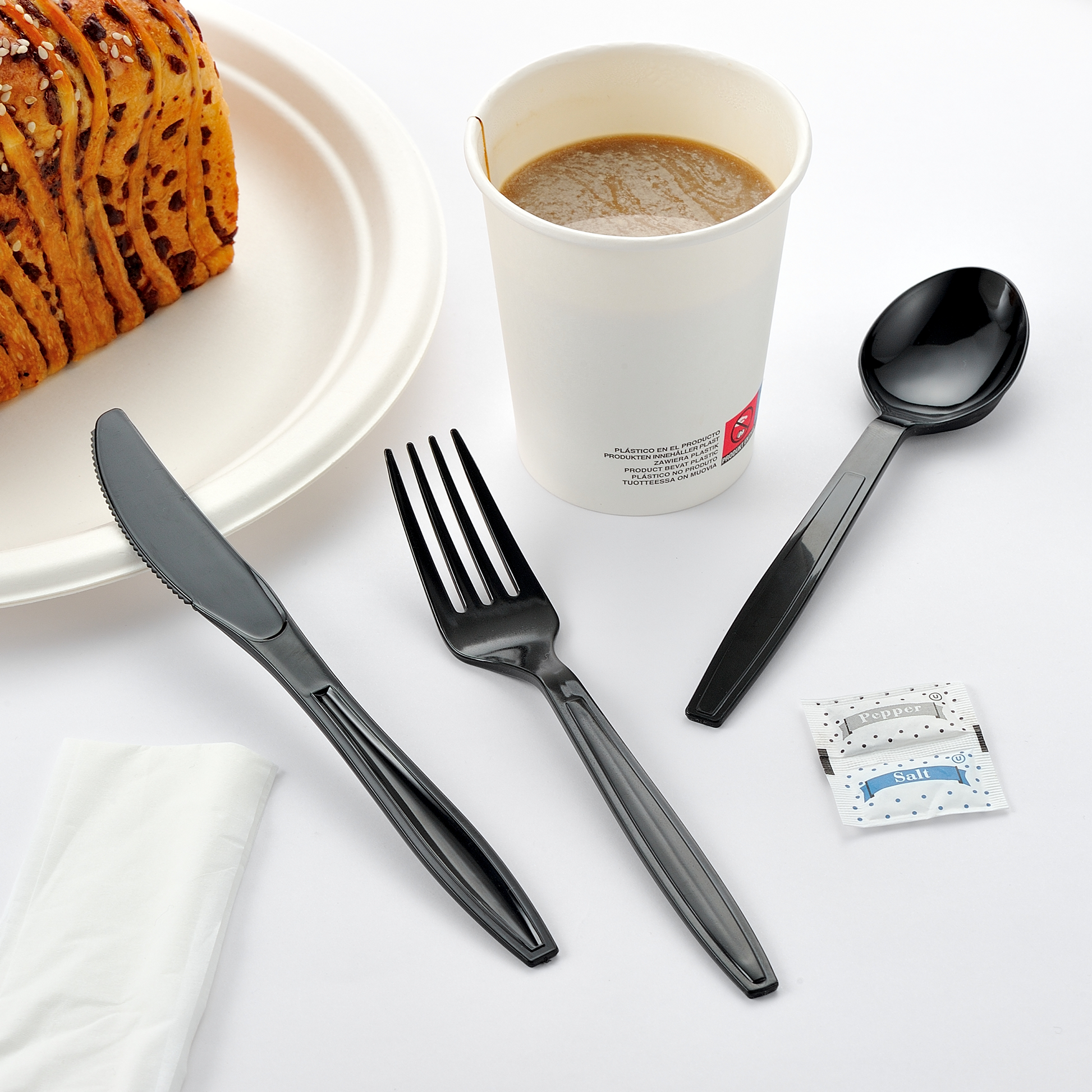 Biocean Heavy Weight Black PS Plastic Cutlery Kits include a knife, fork, teaspoon, a 13×13 cm napkin, and a salt & pepper packet—all in one clean and convenient package. Made from durable polystyrene with a professional black finish, it’s ideal for takeout, catering, and food service operations that need reliable and hygienic disposable cutlery.