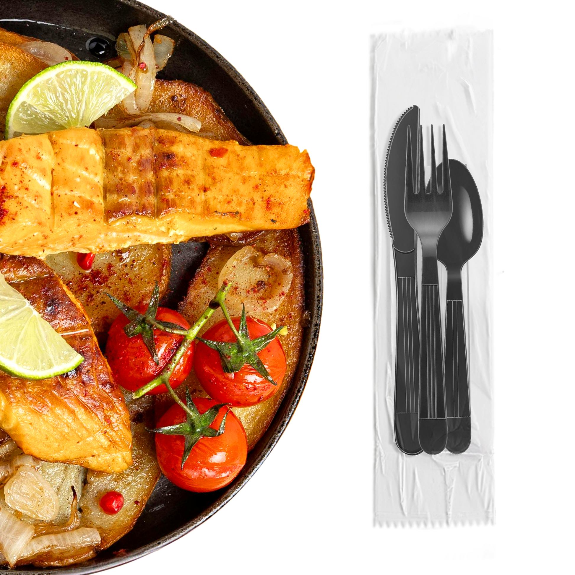 [250ct] PP Plastic Heavy Weight Cutlery Kits(Knife, Fork, Tea Spoon, Napkin) | Black