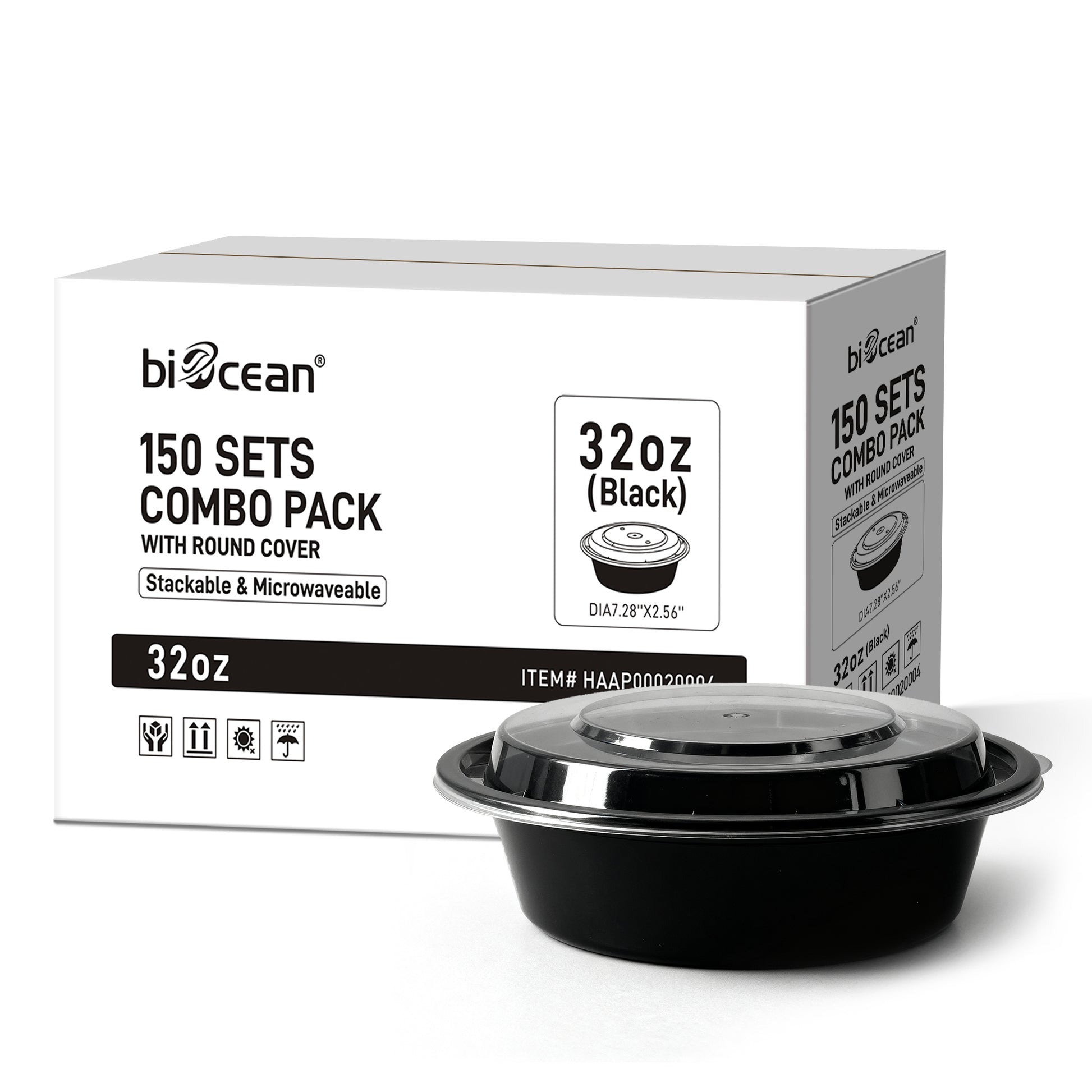 Biocean Microwaveable Round Takeout Containers & Lids made from durable, food-grade polypropylene (PP), these containers are microwave-safe and resistant to cracking or warping. The secure, tight-fitting lids help prevent leaks and keep food fresh during transport. Sleek and professional in appearance, they are ideal for restaurants, catering services, meal prep, and take-out orders.The containers come in various sizes including 16oz, 24oz, 32oz, and 48oz, making them ideal for all your storage needs.