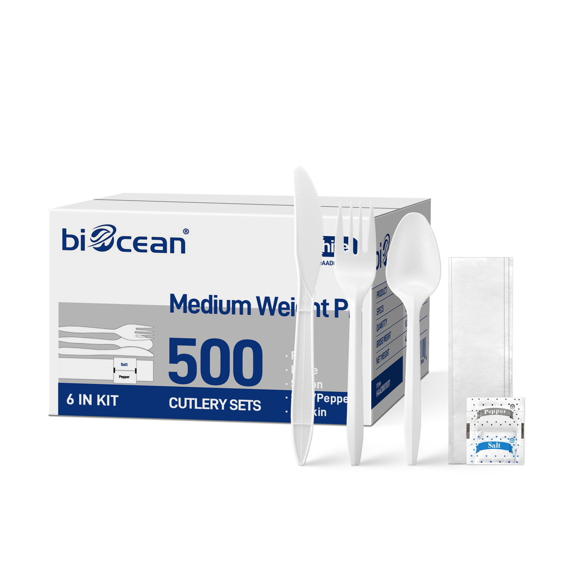 Biocean PP Plastic Medium Weight Cutlery Kits provide a convenient and hygienic dining solution for take-out, catering, or events. Each kit includes a knife, fork, tea spoon, 1-ply napkin, salt and pepper, all individually wrapped for easy distribution. Made from durable polypropylene (PP), this medium-weight set offers reliable strength and comfort for everyday meals. Ideal for restaurants, food trucks, or office lunches, these disposable kits ensure quick service and a clean dining experience.