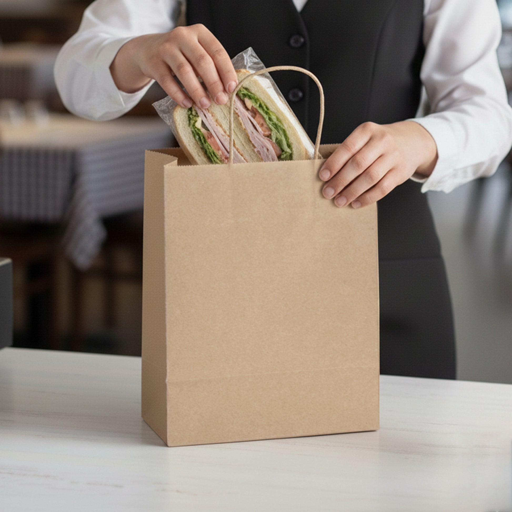 Biocean Kraft Paper Shopping Bags with Handles made from eco-friendly kraft paper, they offer a clean and natural way to pack takeout meals, catering orders, or party supplies. Their durable design keeps items secure during transport, while the recyclable material promotes a sustainable, eco-conscious lifestyle—ideal for restaurants, cafés, and catering services.