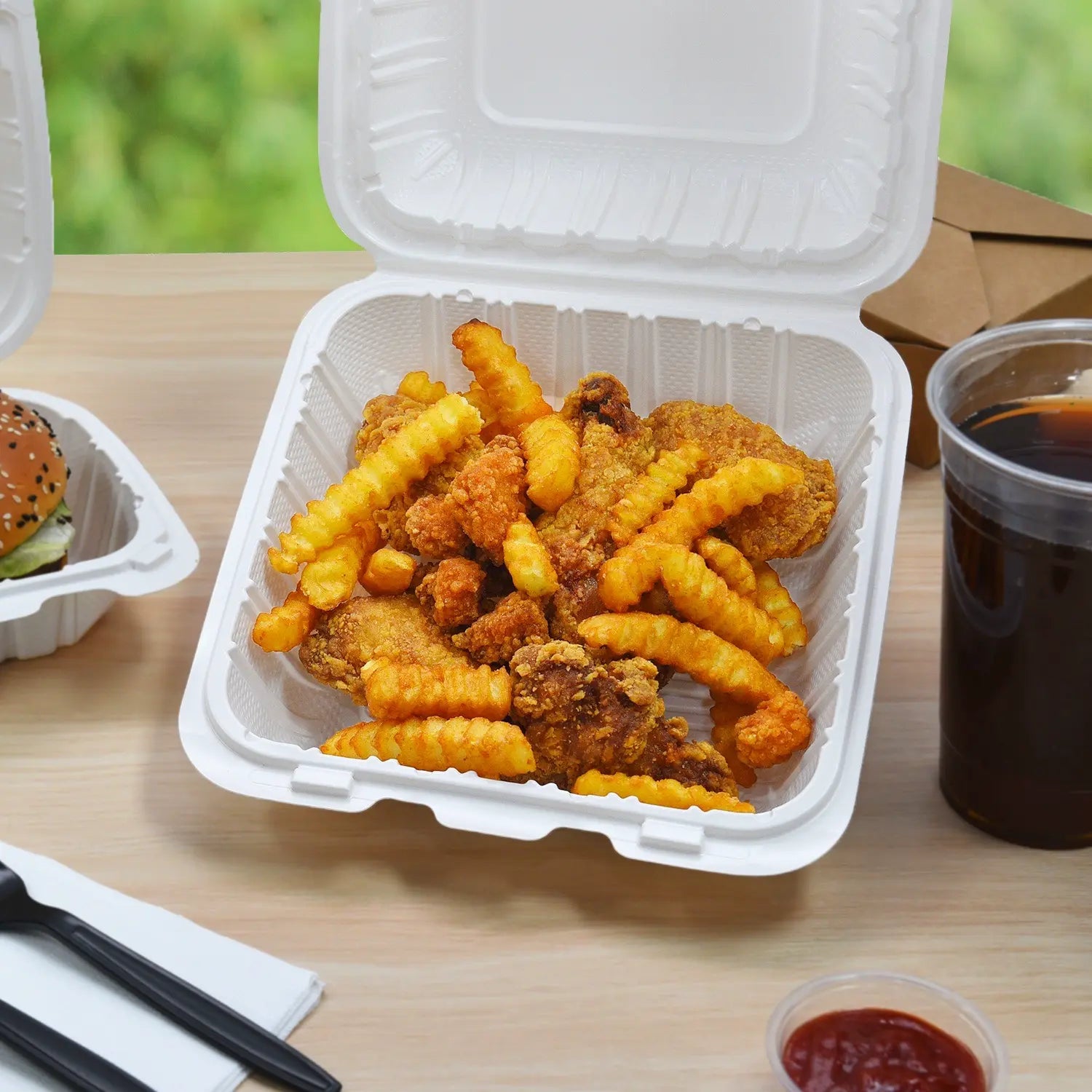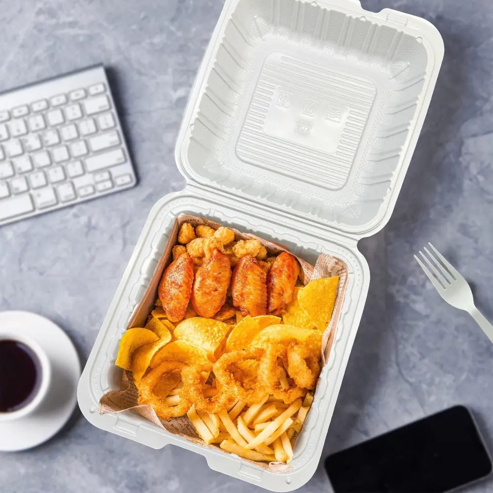 Biocean Mineral Filled White PP Hinged Container designed to hold burgers, sandwiches, and hot foods without squashing. Made from durable white polypropylene, it is safe, eco-friendly, and resistant to oil and moisture, perfect for dine-in or takeout. The hinged design allows easy opening and handling, ideal for restaurants, cafes, food trucks, and other foodservice operations. Each case offers a practical and cost-effective packaging solution, helping busy kitchens operate efficiently while keeping food fresh and presentable.