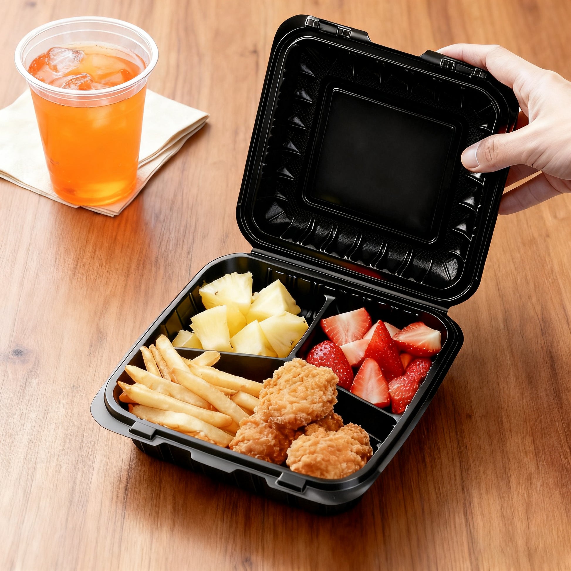 Biocean 3-Compartment Mineral-Filled PP Hinged Food Containers are a sturdy and practical choice for packaging hot or cold meals. Made from high-quality polypropylene (PP), it offers excellent heat resistance, durability, and a sleek black finish that enhances food presentation. The three compartments keep entrees, sides, and sauces neatly separated, making it ideal for combo meals and take-out. Its secure hinged lid provides reliable closure to prevent spills during transport — perfect for restaurants, food trucks, and catering services.