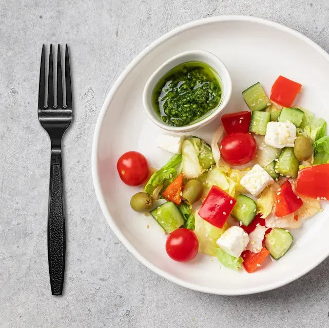 Biocean Heavy Weight Black Textured PS Fork (5g) features a sleek leather-like surface design for an elegant look and comfortable grip. Made from durable PS material, it handles salads, pasta, rice dishes, and desserts with ease, resisting bending or breaking. Packed in a bulk box for convenient storage and large-volume use, it’s perfect for restaurants, takeout services, parties, and events, offering a practical and stylish disposable cutlery option.