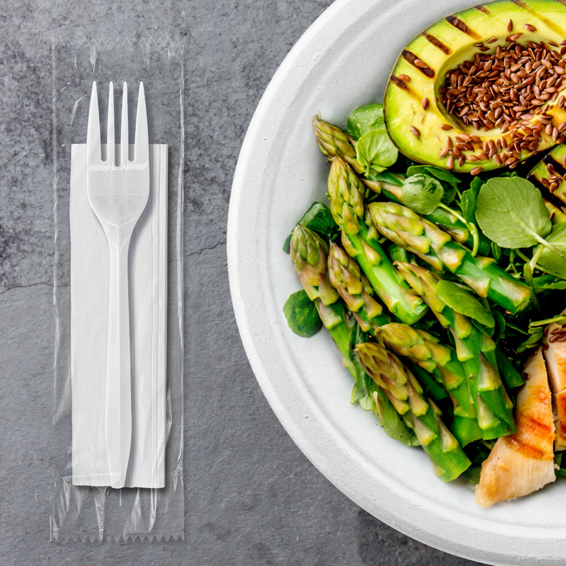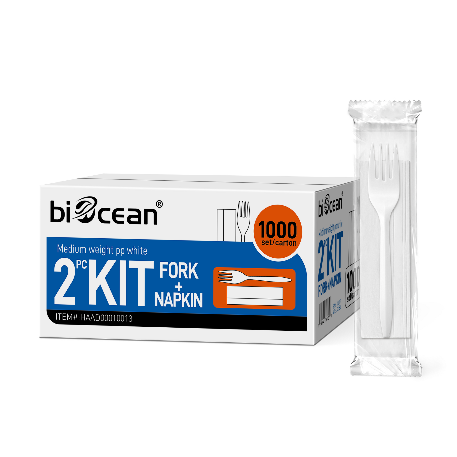 Biocean PP Plastic Medium Weight Cutlery Kits provide a convenient and hygienic dining solution for any occasion. Each kit includes a durable polypropylene fork and a soft paper napkin, neatly packaged for easy distribution. The medium weight design ensures reliable performance for a variety of foods while maintaining comfort and quality. Ideal for takeout, catering, office lunches, and events where cleanliness and efficiency matter.