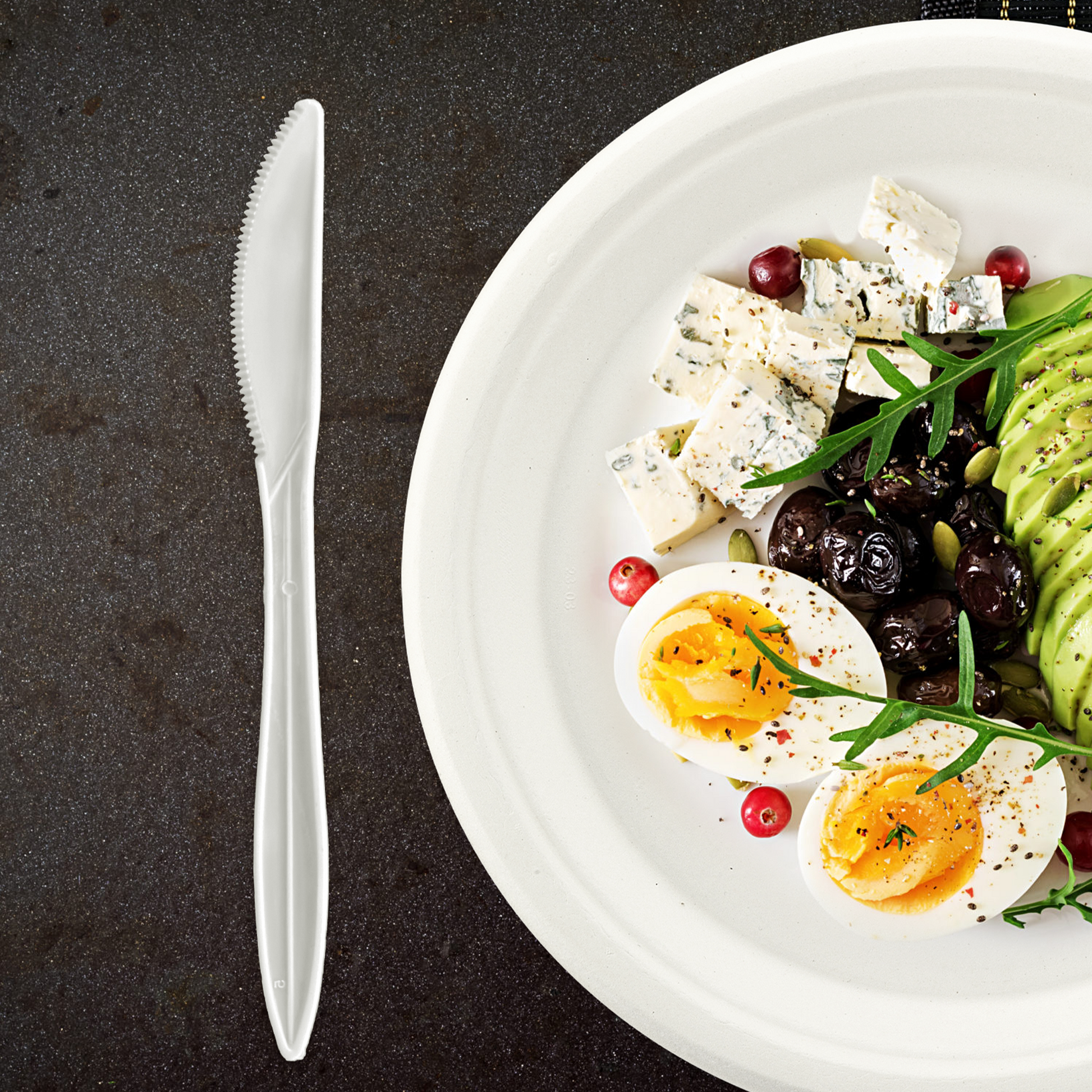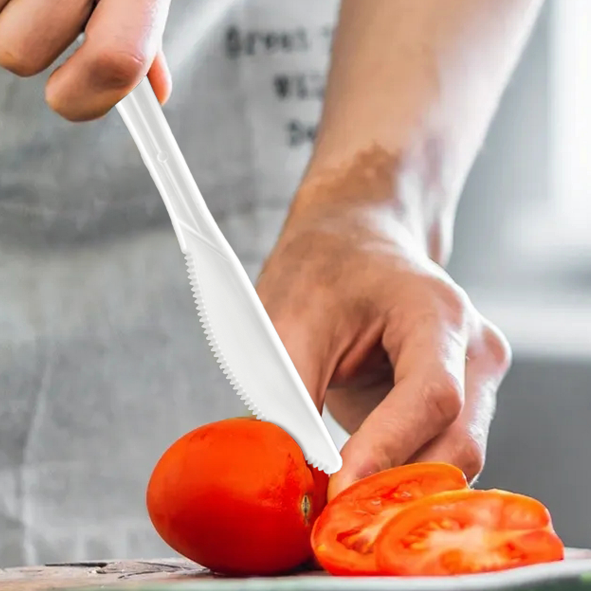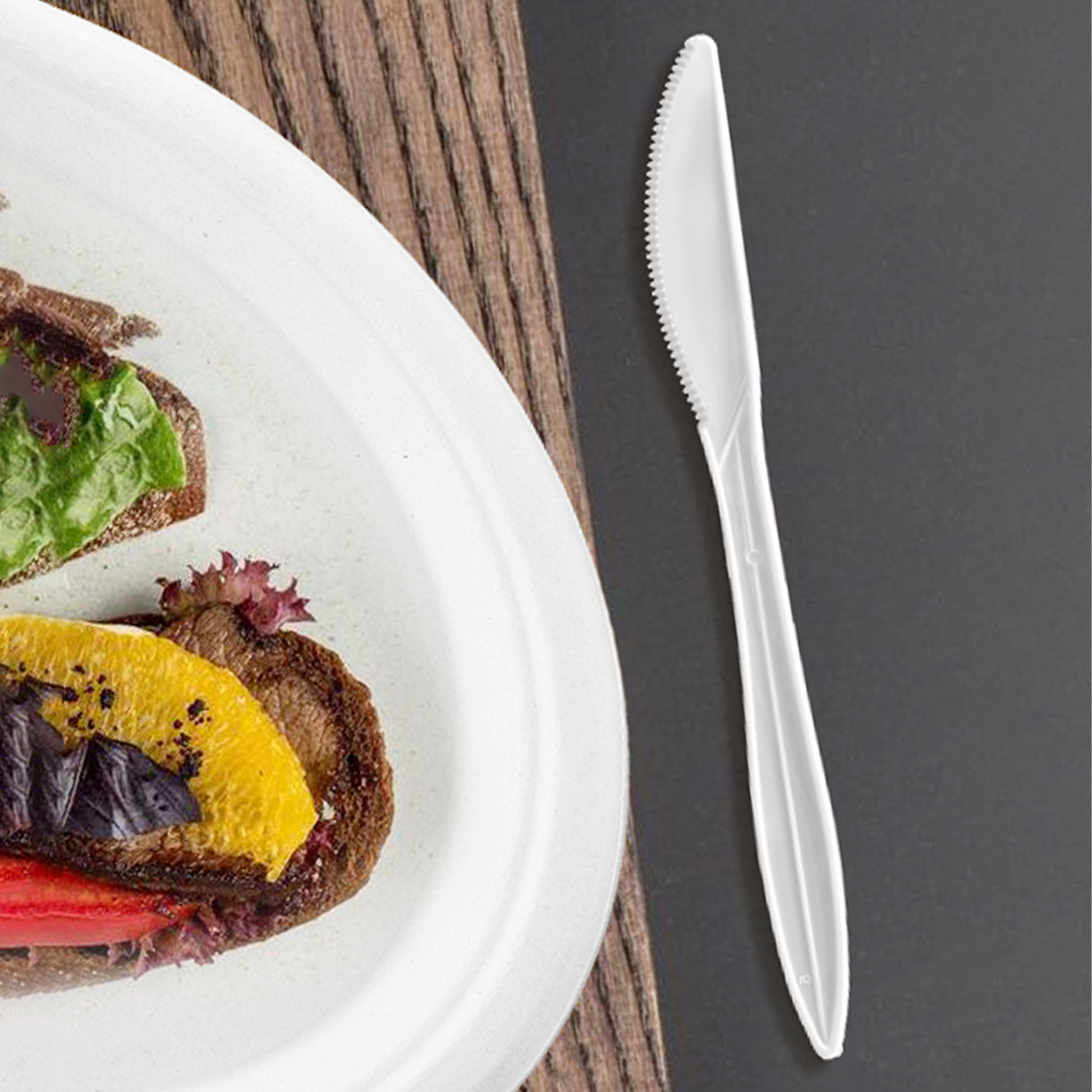 Biocean PP Plastic Medium Weight Knives are made from durable polypropylene, providing the perfect balance between strength and flexibility. Designed for cutting through a variety of foods like fruits, pastries, and light meals, these disposable knives offer reliable performance without bending easily. Their clean white color delivers a professional, hygienic appearance, making them ideal for restaurants, catering, office lunches, and takeout services.
